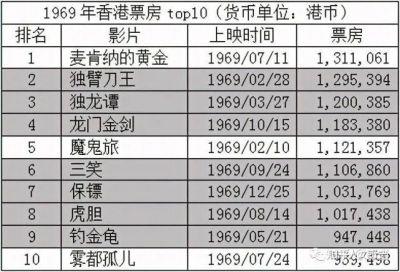 在1969年,香港开始了正式的票房统计。这一年的冠军是由国外影片《麦肯纳的黄金》获得。接下来的几年,香港的票房市场主要由国内外的电影构成。其中,张彻的《独臂刀王》、《保镖》和《铁手无情》分别位居1969年、1970年和1971年的票房排行榜的前列。