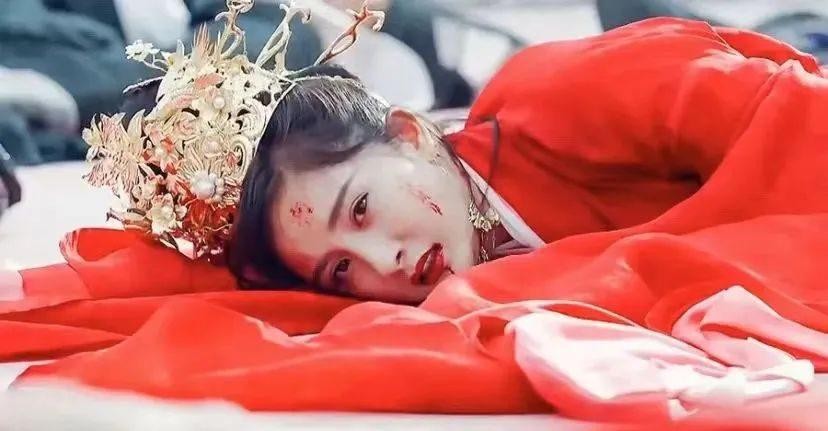 比如《扶摇》中的杨幂,同样是一袭红衣,但她的头型设计配上了更显华丽的黄金头饰,金黄与鲜红形成强烈的视觉冲突,再加上杨幂的战损妆,瞬间有种我见犹怜的即视感,也为整个场面增添一层凄美氛围。