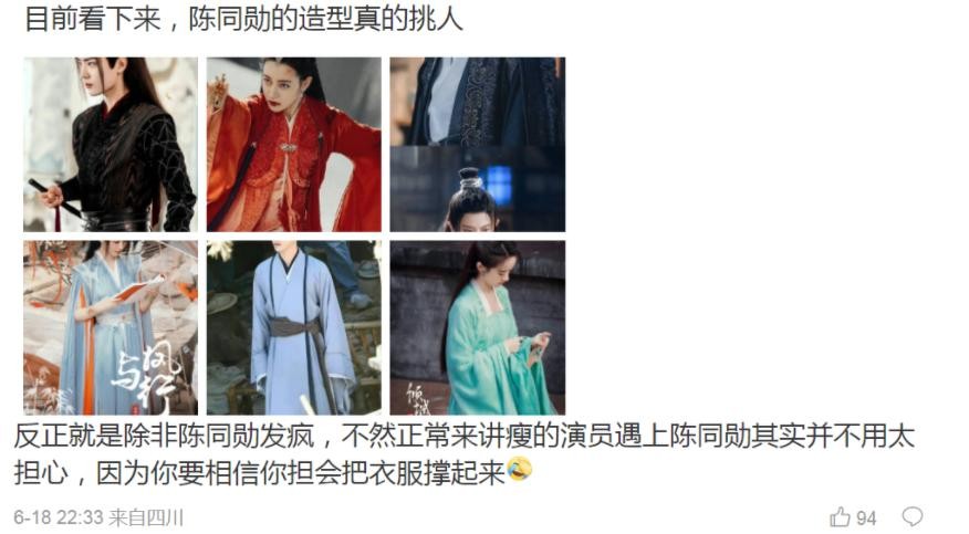 作为众多古偶剧的首选造型师,陈同勋的服装设计时常遭受质疑。就在《与凤行》曝出赵丽颖的首套造型时,就有网友调侃这套长衫就像是袖子开叉。也有人认为造型师的设计十分挑人,对于身材娇小的女星更为适合,可是像热巴这种大骨架美女,反而不容易出彩。