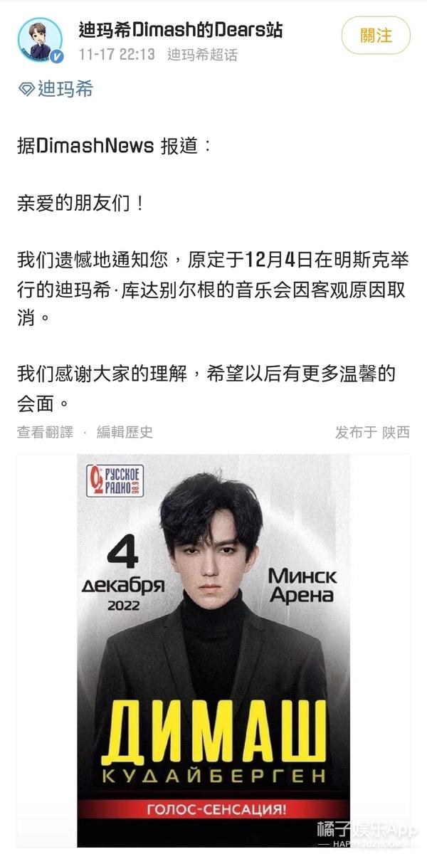 同时DimashNews也报道了原定于12月4日在明斯克举行的音乐会因客观原因取消了。