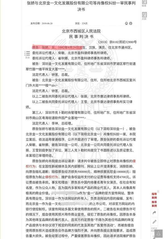 同年,张天爱(原名张娇)跟深圳一家公司打肖像权官司,法院判决书上清楚写着她的出生年份是1992年。这数据应该没法作假吧?除非身份证上的日期是乱填的。不过也不是没有这种可能,毕竟判决书上的出生日期是9月29日,跟百科上的10月28日并不一致。