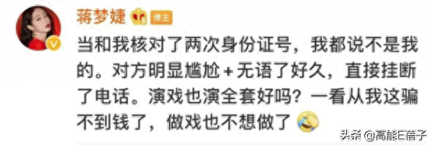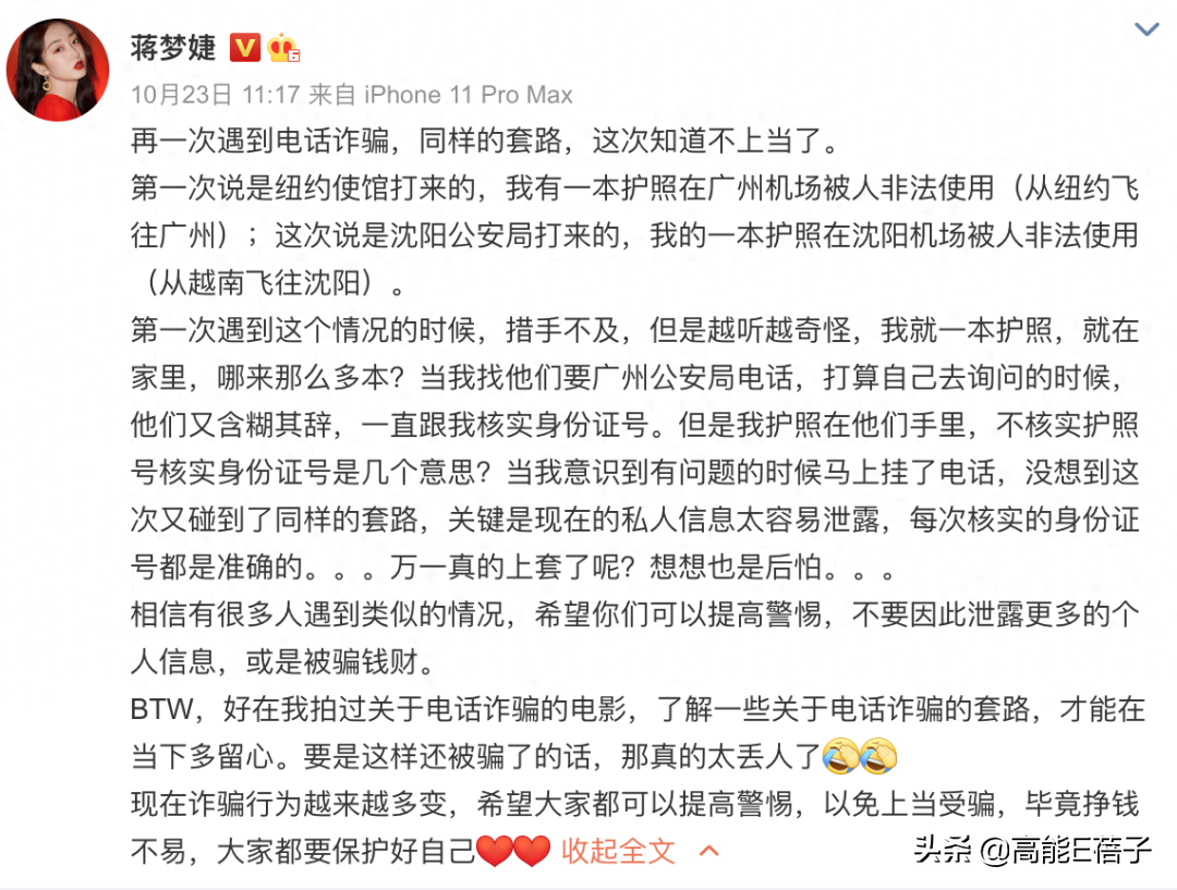 不过也并不是所有明星都中招,蒋梦婕就在社交平台讲了自己第二次遇到电信诈骗的经过。