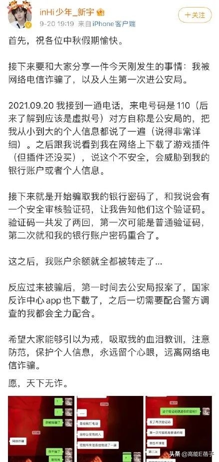 近日,因参加《青春有你》成名的选手王新宇自曝自己在9月20日当天遭遇了电信诈骗,银行卡里的钱全部被骗走了。