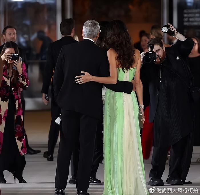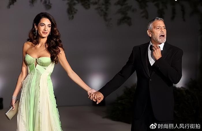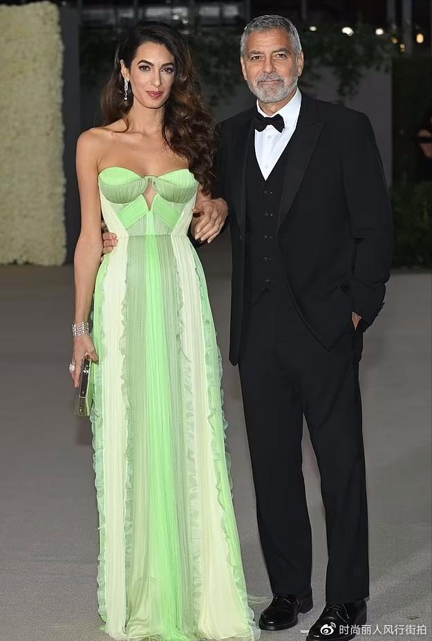 阿迈勒前几天跟着老公一起持续博物馆盛典的时候,选了一件绿色抹胸裙亮相。61岁的克鲁尼头发胡子白了,但是整个人还是老帅哥的气场,完全不显老。阿迈勒走这场红毯的时候,风格又不一样了。