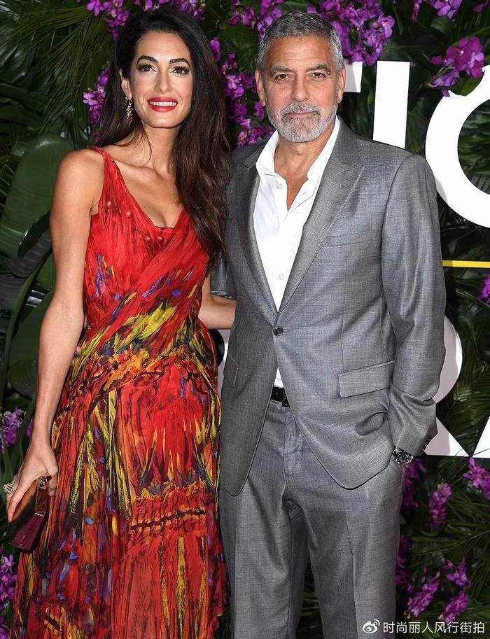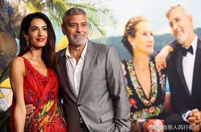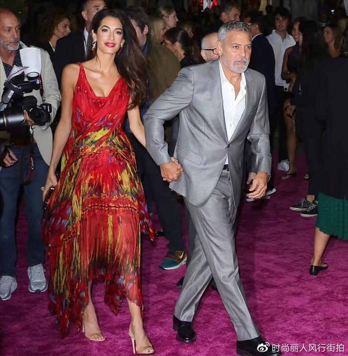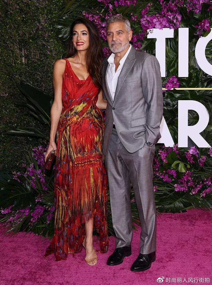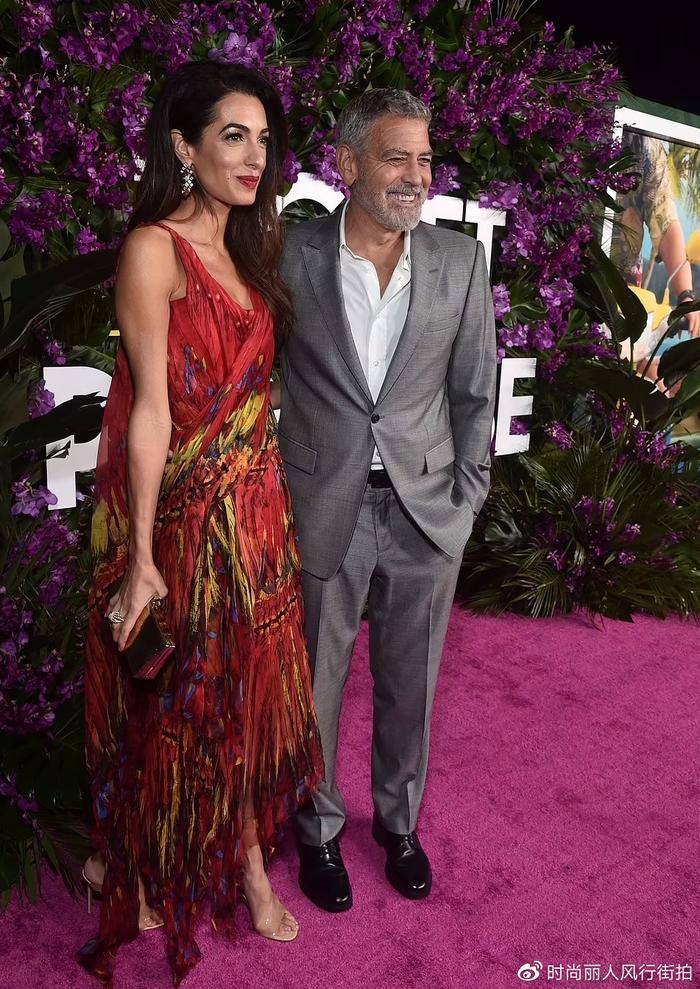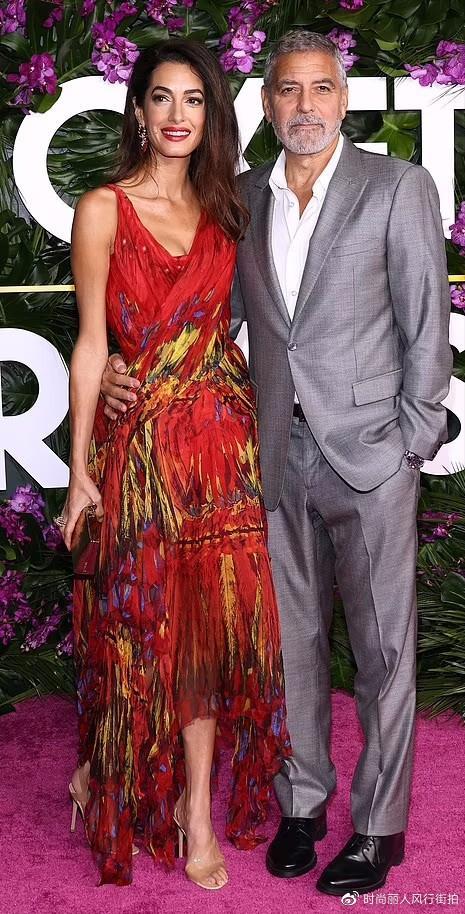 61岁克鲁尼携娇妻闪耀首映礼!律师妻子穿花裙如仙女,真的很般配