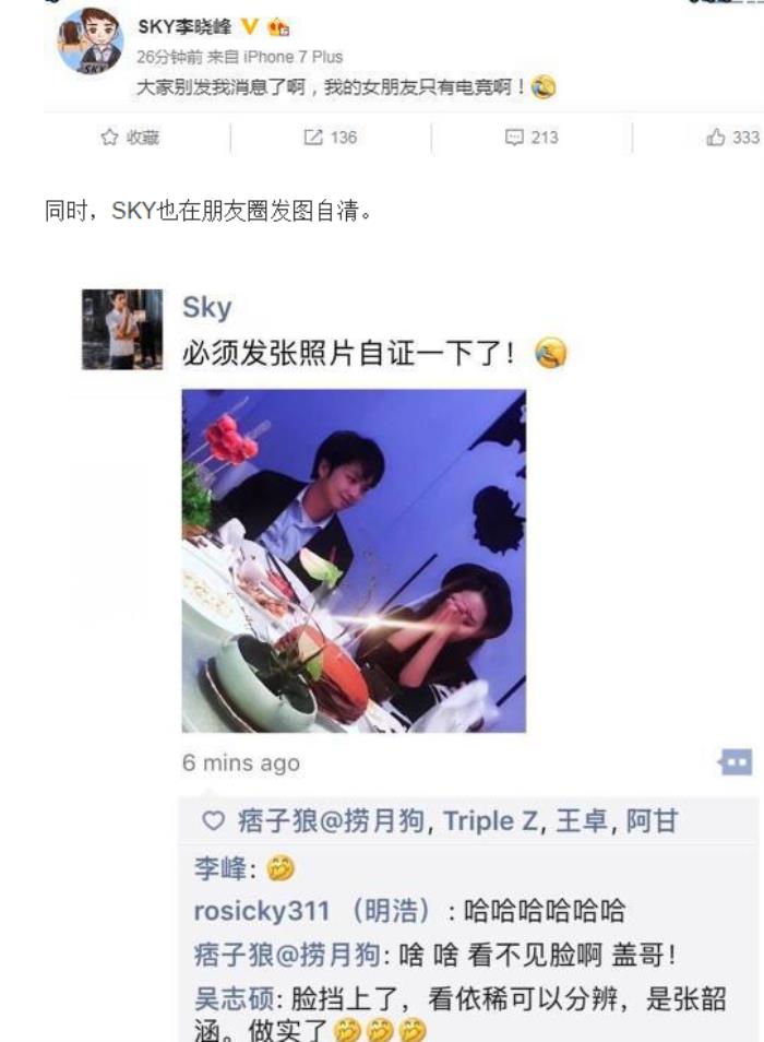 在中国电竞行业有着一定话语权的人皇SKY,如果能与张韶涵在一起那也是很般配的。不过在消息传出不久后,人皇sky就出面澄清说,"我的女朋友只有电竞",还在朋友圈发文自清,看来这波瓜吃得有些尴尬了……