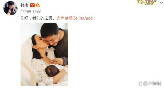 9 月 9 日,韩庚和卢靖姗同时在个人社交平台分享出一家三口幸福合照官宣产女喜讯,晒出的照片中,刚刚生产完的卢靖姗怀中抱着女儿,脸上洋溢着幸福的笑容亲吻老公脸颊,韩庚则弯腰站在妻女一旁,获老婆亲吻的他笑得合不拢嘴,一只手还不忘牵着女儿的小手,画面温馨有爱。