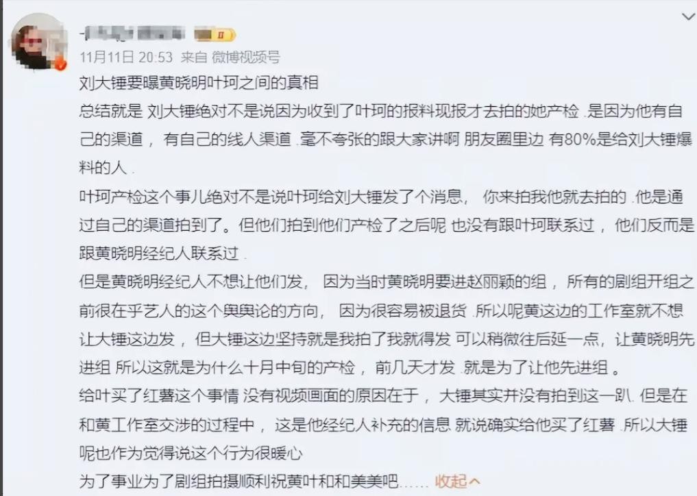 更让大家关注的是,最近刘大锤爆出了叶珂产检的视频,给这段复杂的关系火上浇油。刘大锤不仅曝光了视频,还提到他与黄晓明的经纪人之间的矛盾,透露自己曾试图曝光这个视频,却没有得到经纪人方面的回应。于是,视频虽然被暗藏了好久,但最终还是被“引爆”了。这一举动引发了网友的激烈讨论,“黄晓明、叶珂、刘大锤之间到底有多少内幕?”成了大家关注的焦点。
