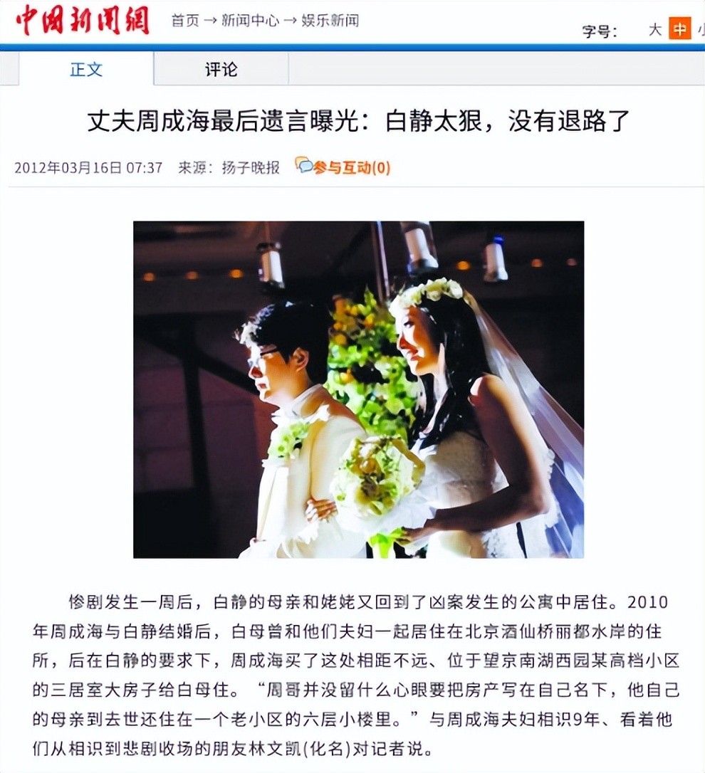 信息来源:中国新闻网2012.3.16——丈夫周成海最后遗言曝光:白静太狠,没有退路了