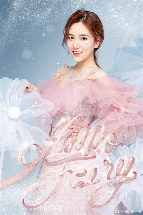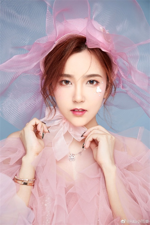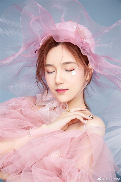 第一张照片是Rita的上半身照,从下图中能够看出Rita身上穿着粉白色调的衣服,头上顶着粉红色的帽子,而这身衣服以及帽子最大的特点则是带着一丝透明,看上去格外柔和,跟婚纱服都有得一比了,图片中的Rita像是新娘般的美丽!