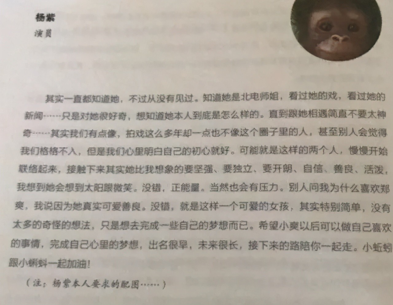 不得不说下杨紫在序言里留的头像,别的明星都是用真人头像,只有她留了一个猩猩的头像,还注明是杨紫本人要求的配图,不知道有什么寓意,真的有点调皮。