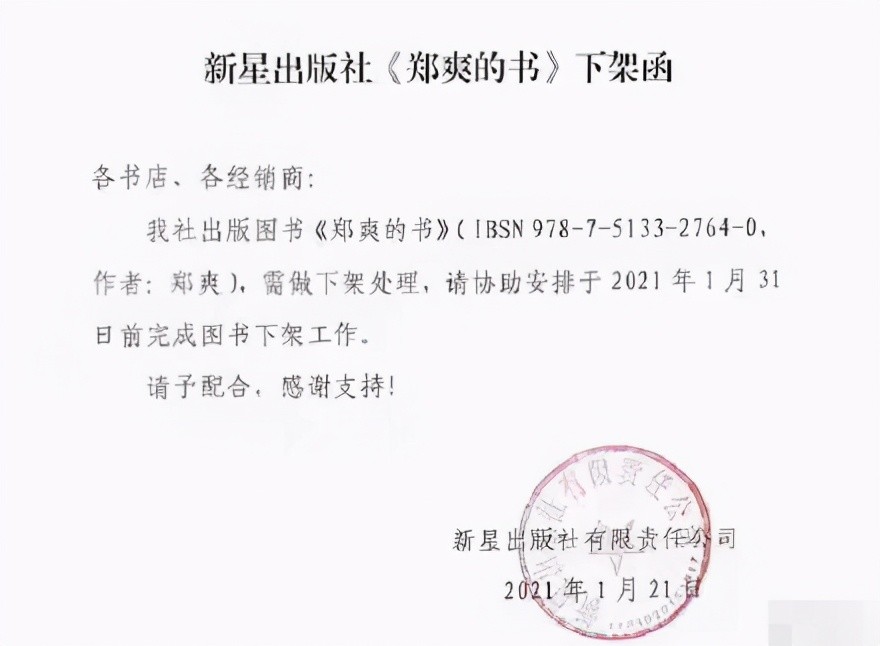 1月21日,网上流传一份新星出版社发给全国各大书店以及经销商的下架函。下架函明确要求将《郑爽的书》做下架处理,并且于本月内就要完成图书下架工作。