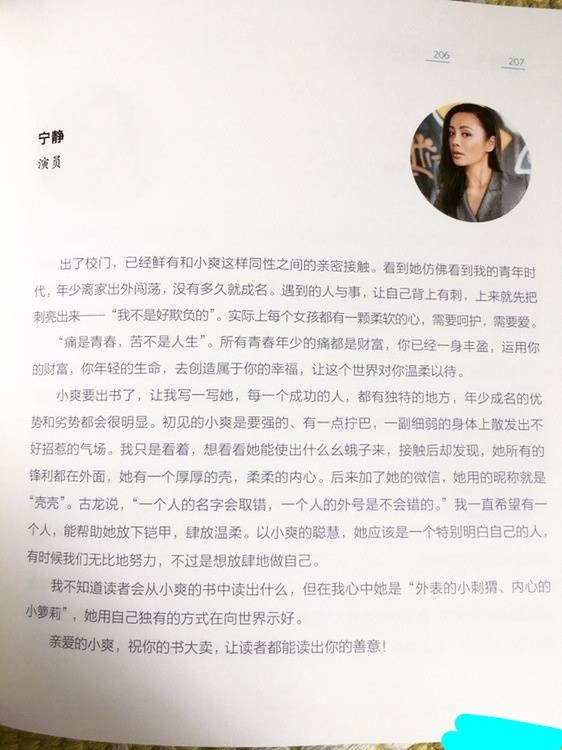 宁静的序言写的很用心:看到她仿佛看到我的青年时代,年少离家出外闯荡,没有多久就成名。遇到的人和事,让自己的背上有刺,上来就先把刺亮出来——“我不是好欺负的”。实际上每个女孩都有一颗柔软的心,需要呵护,需要爱...初见小爽是要强的,有一点拧巴…我只是看着,想看看她能使出什么幺蛾子来…她应该是一个特别明白自己的人,不过是想放肆的做自己…。解释了郑爽的拧巴是因为“外表的小刺猬,内心的小萝莉”,也看出郑爽是“想放肆的做自己”,可见宁静比较懂郑爽。