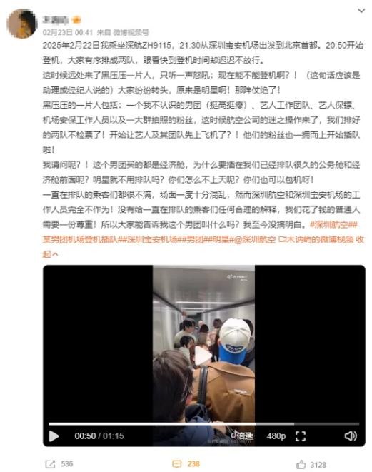 2月22日晚,深圳宝安机场上演了一场因“明星特权”引发的争议。深圳航空ZH9115航班登机口前,乘客们按序排队的平静被突然涌入的男团Loong9及其团队打破,场面一度混乱。这场风波不仅暴露了明星团队与公共秩序的冲突,更引发了公众对“特权文化”的强烈质疑。