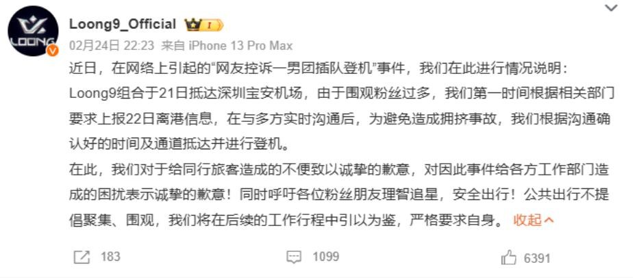24日晚,Loong9官微发布声明,称因“围观粉丝过多”,提前与机场、航司沟通后安排特殊通道登机,以避免拥挤事故。但声明未承认插队行为,仅将责任归为“多方协调结果”,并呼吁粉丝理智追星。
