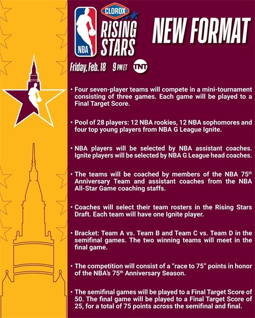 NBA今天公布了全明星新秀挑战赛的全新赛制,具体内容如下: