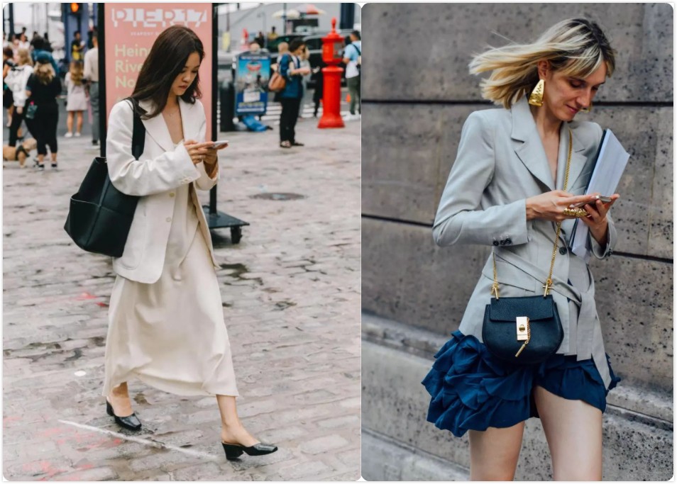 西装外套的率性与裙装的妩媚柔情结合,会让你有优雅大气而不失女人味。刚开始尝试这种穿搭风格的姐妹,可以先尝试这种同色系搭配,选择一条有质感的长裙,非常有轻熟感,不容易踩雷。如果你的气质属于那种较为奔放类,大可以选择一条亮色系的短裙,吸睛的同时造型感满满!