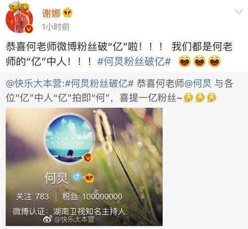 何炅粉丝破亿了!同是“亿万富翁”的谢娜发文祝福