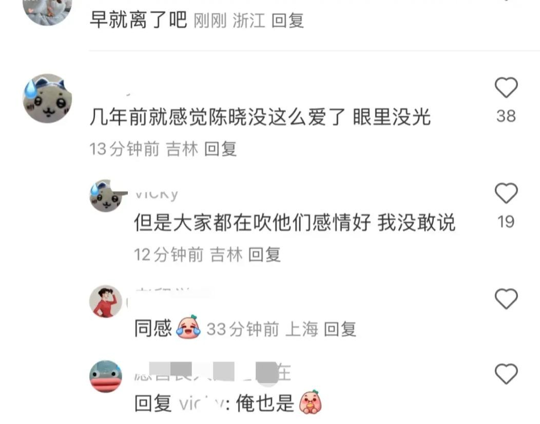 2019 年,两人因为交谈时面无表情,离婚的传闻再次甚嚣尘上。但在陈妍希生日时,陈晓的一篇生日祝福打破了所有的传言。而后来的几年,又有言论称陈晓眼里没有光了。面对这样的质疑,陈妍希半开玩笑地回应:他又不是奥特曼,眼里怎么会有光呢?可网友们却坚定地认为,曾经的陈晓眼中满是光彩。