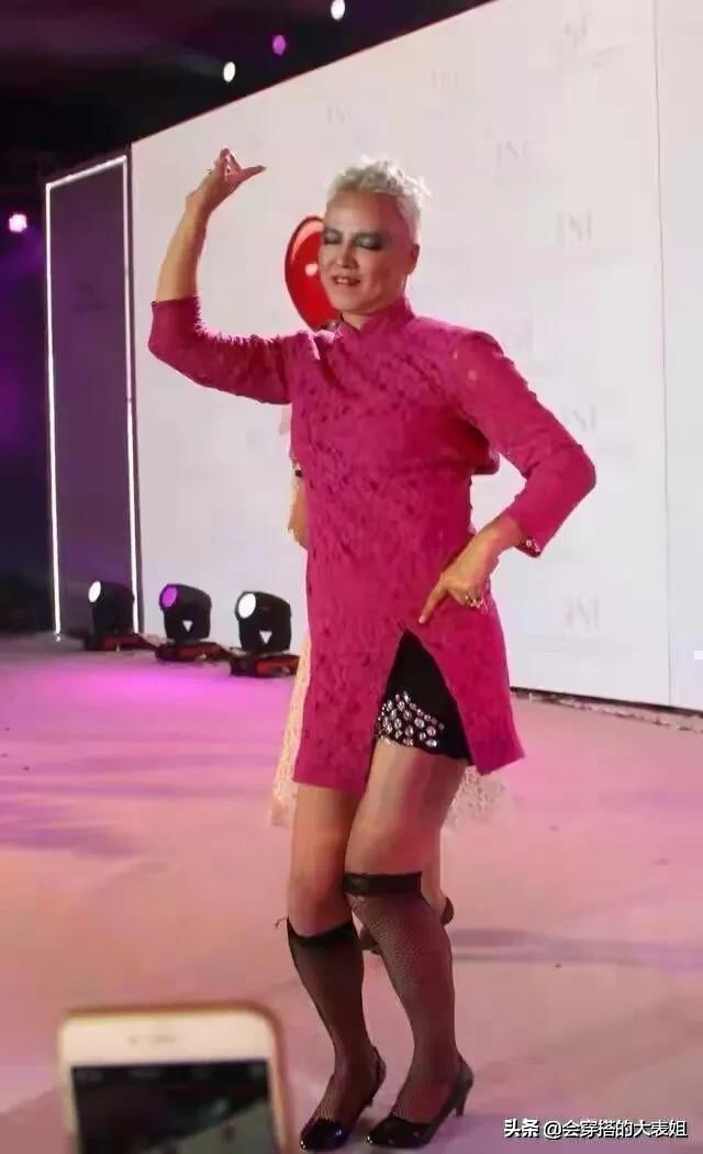 旗袍下摆处运用了开叉设计,既能显腿长,又给人多几性感的味道。内搭的黑色若隐若现的,性感又诱惑!露出裤边镶嵌的水钻,超廉价俗气。下穿高跟鞋和鱼网袜,辣眼又妖媚极了!跳起女团舞来,这神情,这动作入木三分,真是又娘又骚的,又婉若小丑般滑稽搞笑!看来他真的挺有喜剧表演的天赋哦!