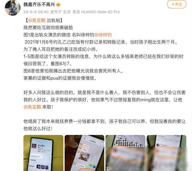 近期,娱乐圈内发生了一起重磅事件,涉及知名演员高亚麟。他被前女友魏嘉公开指责有家暴及出轨行为。魏嘉在社交媒体上披露了与高亚麟的私人对话和财务交易记录,试图证明其指控的真实性。魏嘉透露,她在怀孕期间遭受了高亚麟的暴力对待,并且发现他与另一名女性徐梓钧有不正当关系。