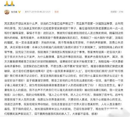 前一段时间,内地知名男演员张丹峰与其女经纪人毕滢的出轨风波闹得沸沸扬扬,后来事情进入了一段平静期,就在大家快要忘却本次事件的时候,张丹峰在5月6号晚间,微博发表一篇文章又将这件事推上风口浪尖。