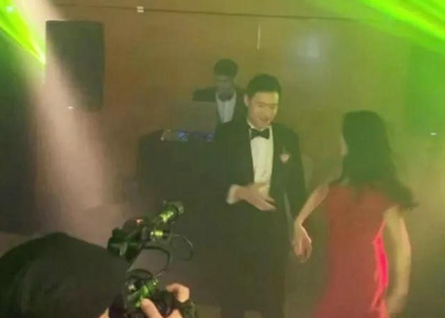 婚宴现场,杨永晴穿上了红色的露肩礼服,在众人的拥簇下与新郎翩翩起舞。