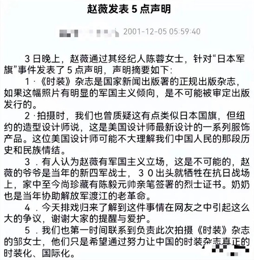 她在拍摄某时尚杂志时,身穿印有疑似日本旭日旗图案的服装,这一细节在三个月后才被网友发现,随即引发轩然大波。面对舆论,她的团队急忙发声明澄清,称她本人并不知情,但公众并不买账。这场风波让她的爱国形象破灭,事业受到严重影响。