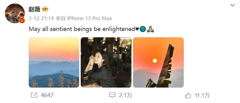 就在前不久,赵薇在生日当天发文,配文内容翻译过来就是“愿一切众生都开悟”。