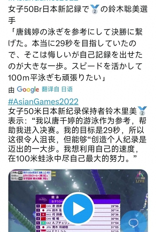 铃木里美作为日本游泳界的代表,在接受媒体采访时表示,她一直以来都以中国选手唐千婷的游泳作为参考,因为唐千婷在技术和力量方面都具备出色的平衡,给予了她很大的启发。