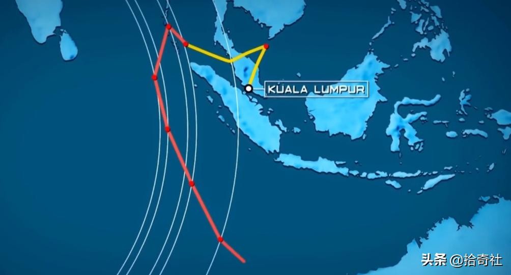 失联之后的MH370在空中先是拐了一个大弯,然后突然往回飞,经过槟城机场,沿着直线往西南方向飞行,一直到最后消失在雷达监测范围内。