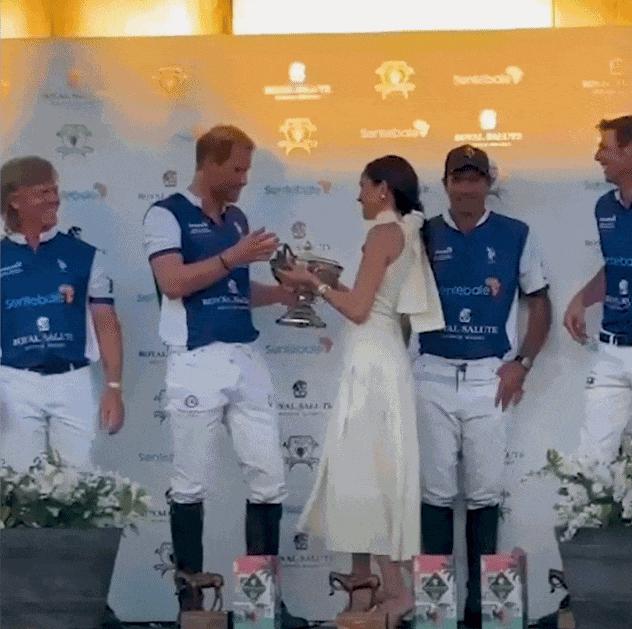 上周末,哈里在佛州参加慈善马球比赛,带队夺冠。梅根亲手送上大奖杯 ↓↓
