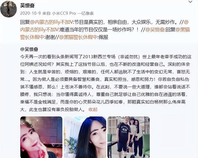 直到 7 年前,也就是 2020 年,吴愤奋在自己的社交平台上发了一段长文,表达了自己的一些新的感悟。在这个 " 心灵鸡汤 " 的下面,有网友直接留言问她 " 当初的节目仅仅是一场炒作吗 ",而她则霸气的回答 " 节目是真实的,无需炒作 "。