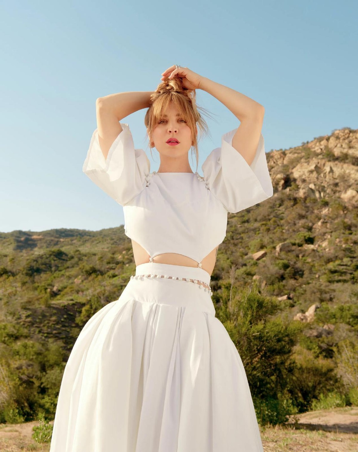 而在另一套造型中,佩妮高抬双臂,将一头金发高高卷起,露出精致的五官,红唇微张,眼神魅惑,身子也跟随着起伏的山势轻轻扭动,白色的裙装又将整个人衬得干净又温柔,美得不像话。