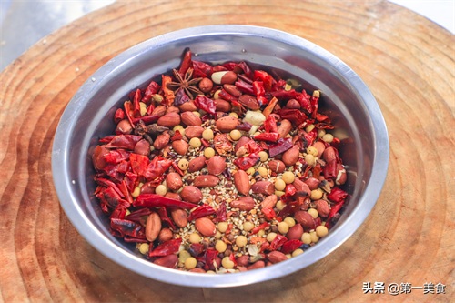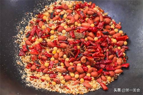 首先,我们取一个小盆。放入洗净的花生100克、黄豆50克,然后加入干辣椒段50克、白芝麻20克,再放入八角2粒、花椒20克以及一节桂皮备用。