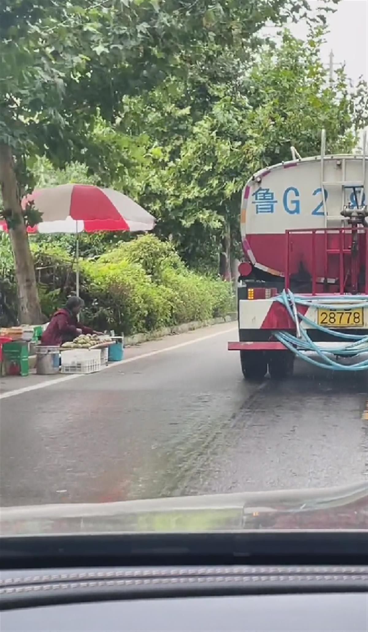 10月7日,视频发布者高先生告诉极目新闻记者,6日中午,他路过山东潍坊青州市的一条乡道时拍下了这段视频。因村里道路较窄,对向还一直来车,所以他一直跟在洒水车后面行驶。跟了两三分钟后,高先生发现洒水车每次路过路边卖农货的摊位或行人时,都会及时关水。因洒水车行驶较慢,他在其后跟了大概一公里,发现几乎没有摊贩被水溅到。