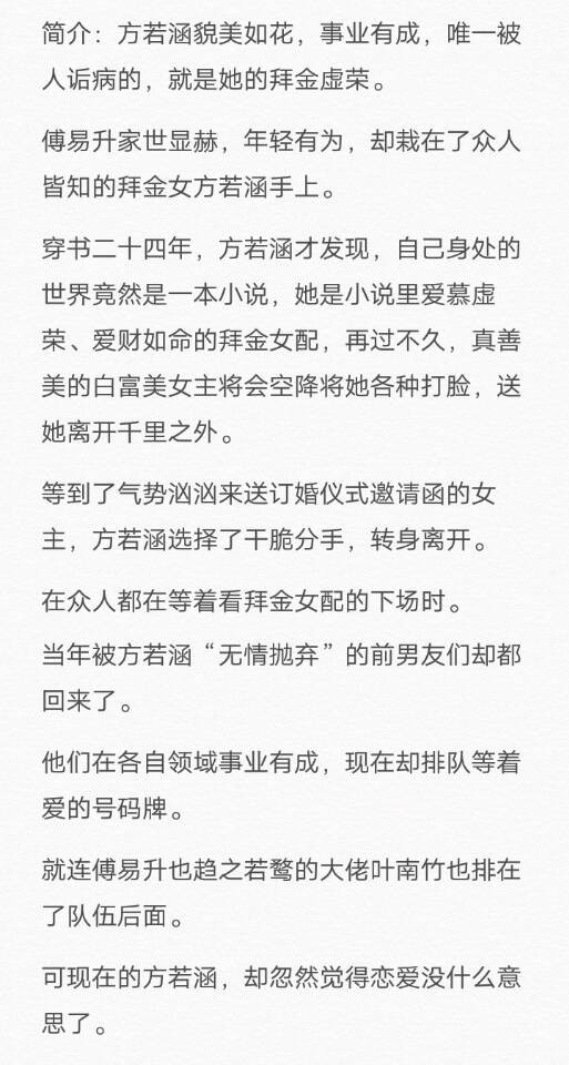 这本小说作者文笔很不错,前面开始的时候可能有点看不下去,女主总是逃避,但后面越来越好看。喜欢看女配类型小说的小伙伴,可以看看这本书。