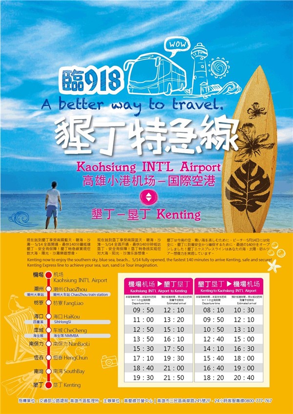 本站至垦丁约2小时30分,班距约20-30分。详班次表(高雄发车至机场约需30-40分)。 班车时间:上午6时 至 隔日凌晨1时。 ※以上资讯以该公司公告为准