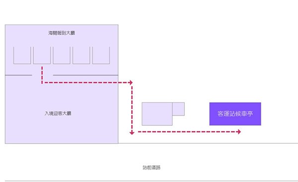 前往候车亭请由海关报到大厅进入入境迎客大厅后,左转直走出大厅后右转到站前道路后,再左转即可抵达客运站候车亭