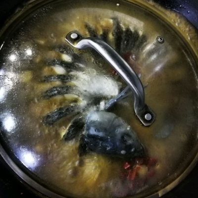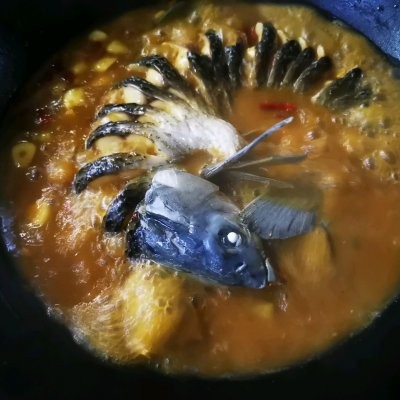 5、热锅,下入适量的菜籽油,放入姜块,蒜块,爆香,加入一丢丢豆瓣酱,炒香,加入野山椒,后加入清水,水量要末过鱼。 加入料酒适量,啤酒也行,汤底调味:加入少许盐,味精,鸡精,味极鲜少许,然后放入清水鱼,小火慢炖8分钟左右。