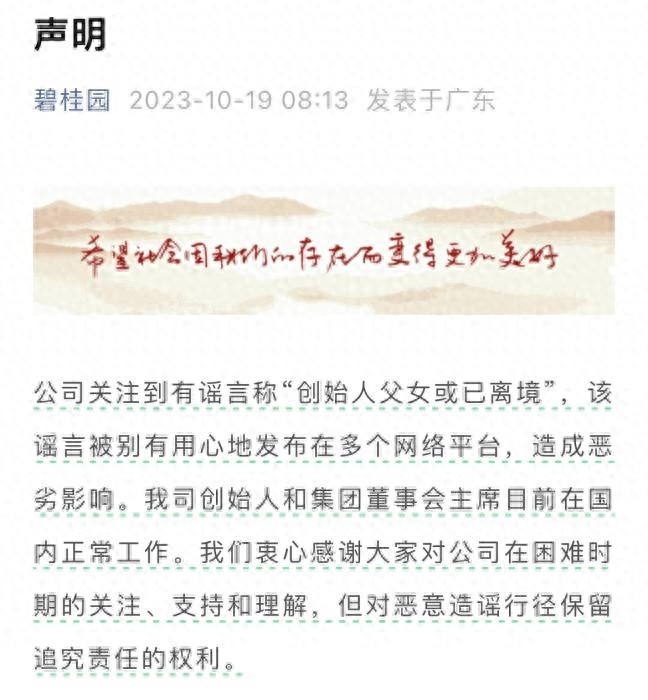 10月19日,碧桂园在其官方微信公众号发表声明,澄清了关于创始人及其家人离境的谣言。公司表示,目前创始人和董事会主席都在国内正常工作,谣言的散布造成了恶劣的影响,公司保留追究责任的权利。同时,该公众号还提到了中国农业发展集团有限公司一行到访碧桂园总部的情况,并强调了公司的战略定力和科技建造优势。