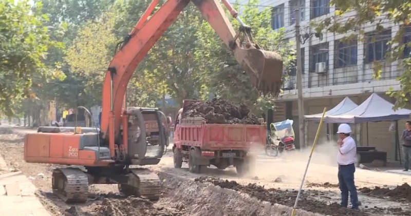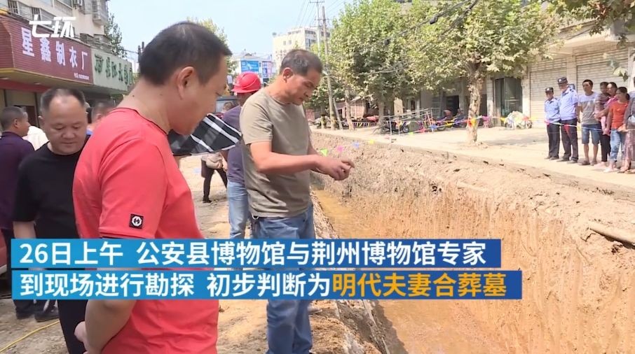 9月25日,湖北荆州。南平镇街道施工挖到两座古墓,专家勘探后初步判断为明代夫妻合葬墓。墓葬在路面下约50厘米处,墓坑深约1.5米。下一步将对古墓葬抢救性发掘。