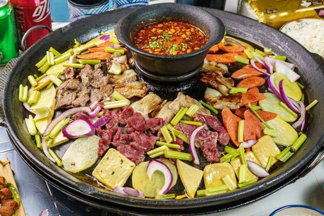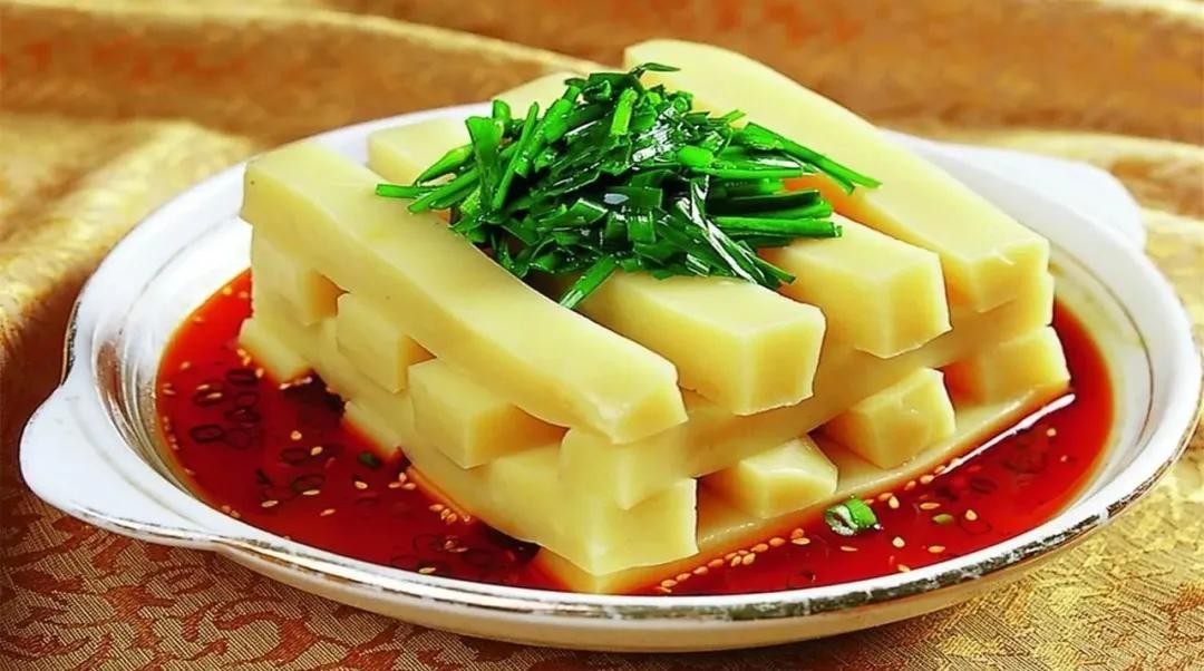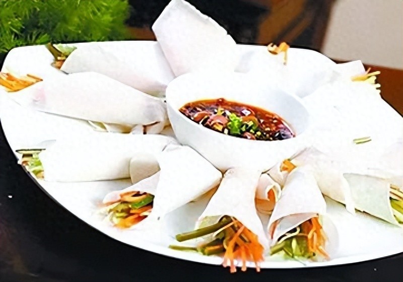 这名字就透着股可爱劲儿,感觉就像一个个小巧玲珑的娃娃。它其实是一张薄如蝉翼的面皮,裹上各种切成丝的新鲜蔬菜,像黄瓜、豆芽、土豆丝、海带丝等,再搭配酸辣可口的蘸水一起吃。蔬菜的清爽脆嫩和薄饼的软糯完美搭配,使得这道菜备受欢迎。