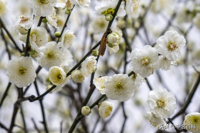 2. 绿萼梅:绿萼梅的开花时间也在1月中旬到2月上旬。它的花朵非常特别,花瓣是白色的,而萼片却是绿色的,这在梅花品种中很少见。绿萼梅的花香清幽淡雅,花朵多为单瓣或复瓣。在浙江杭州的一些园林里,绿萼梅盛开的时候,白色的花朵在绿色萼片的衬托下,显得格外高洁雅致,吸引了不少摄影爱好者前来捕捉这美丽的瞬间。