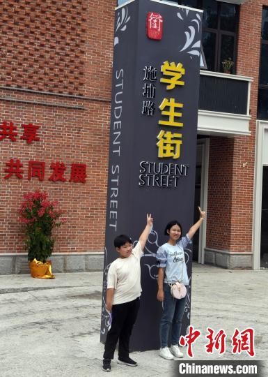 二名小朋友在福州学生街特色街区前留影。 刘可耕 摄