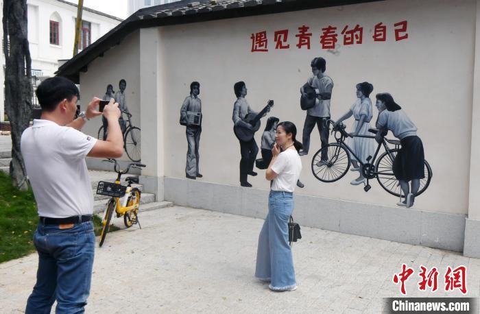 一名女青年在福州学生街特色街区青春墙绘前留影。 刘可耕 摄