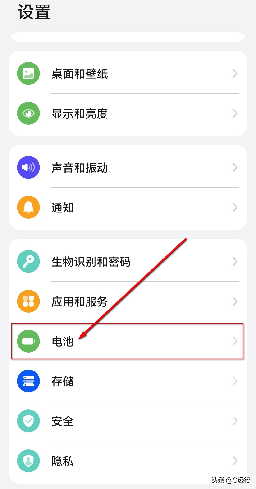 打开手机设置界面,点击“电池”图标进入。