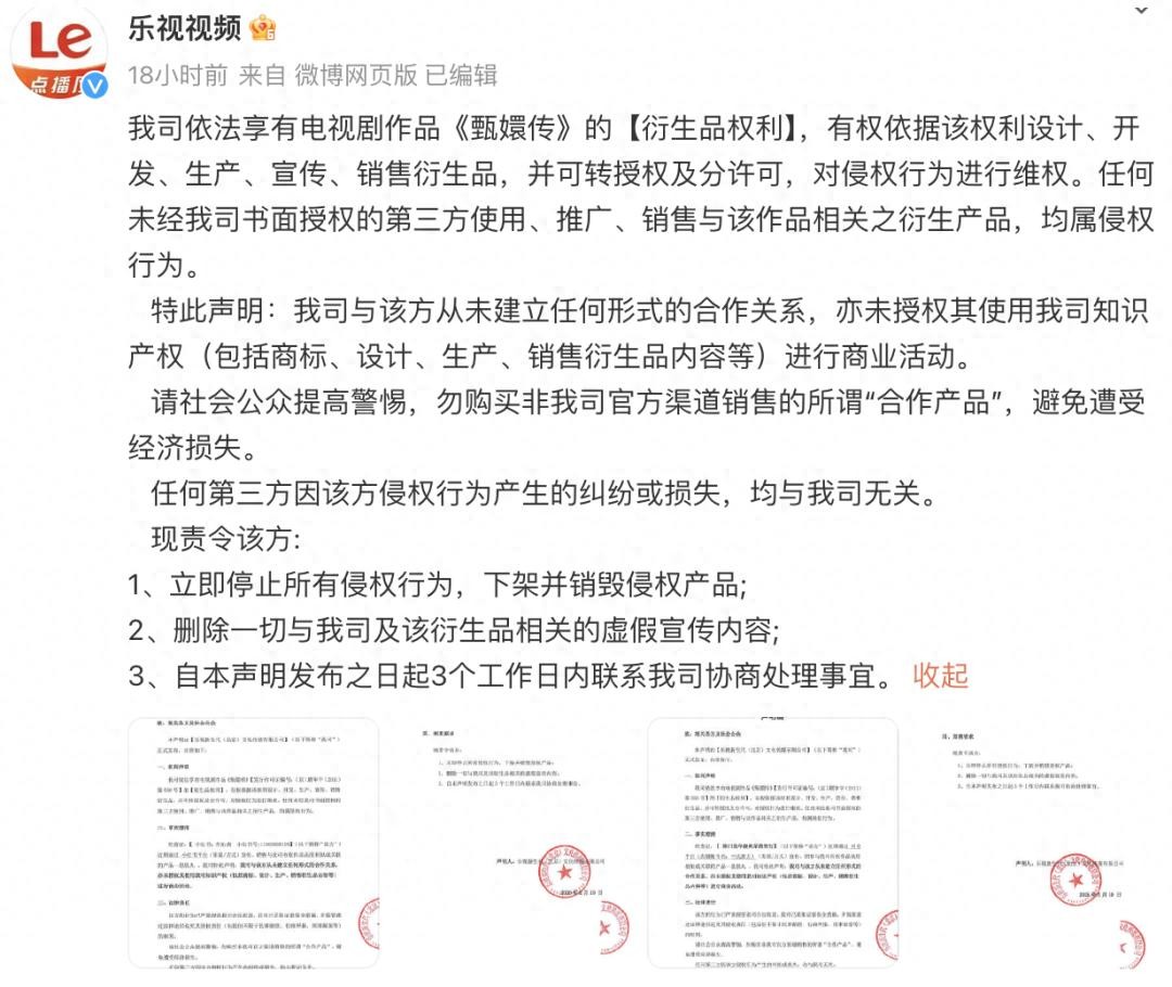 乐视视频责令该方:“立即停止所有侵权行为,下架并销毁侵权产品;删除一切与我司及该衍生品相关的虚假宣传内容;自本声明发布之日起3个工作日内联系我司协商处理事宜。”