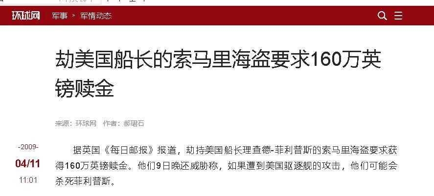 【1】环球网——劫美国船长的索马里海盗要求160万英镑赎金