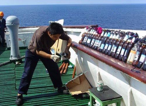 为了防止海盗靠近船员,船长带头向甲板上投掷玻璃瓶,这让没有穿鞋的海盗吃了不少苦头。